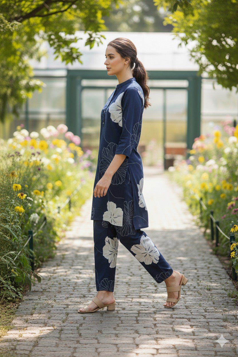 Bold yet refined, this navy blue co-ord set captures modern minimalism with a touch of artistic flair. The collared kurta features oversized ivory floral motifs that add visual balance and sophistication, complemented by matching straight-fit pants for a coordinated, contemporary silhouette.
