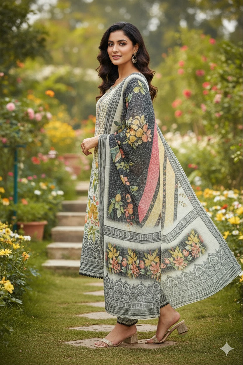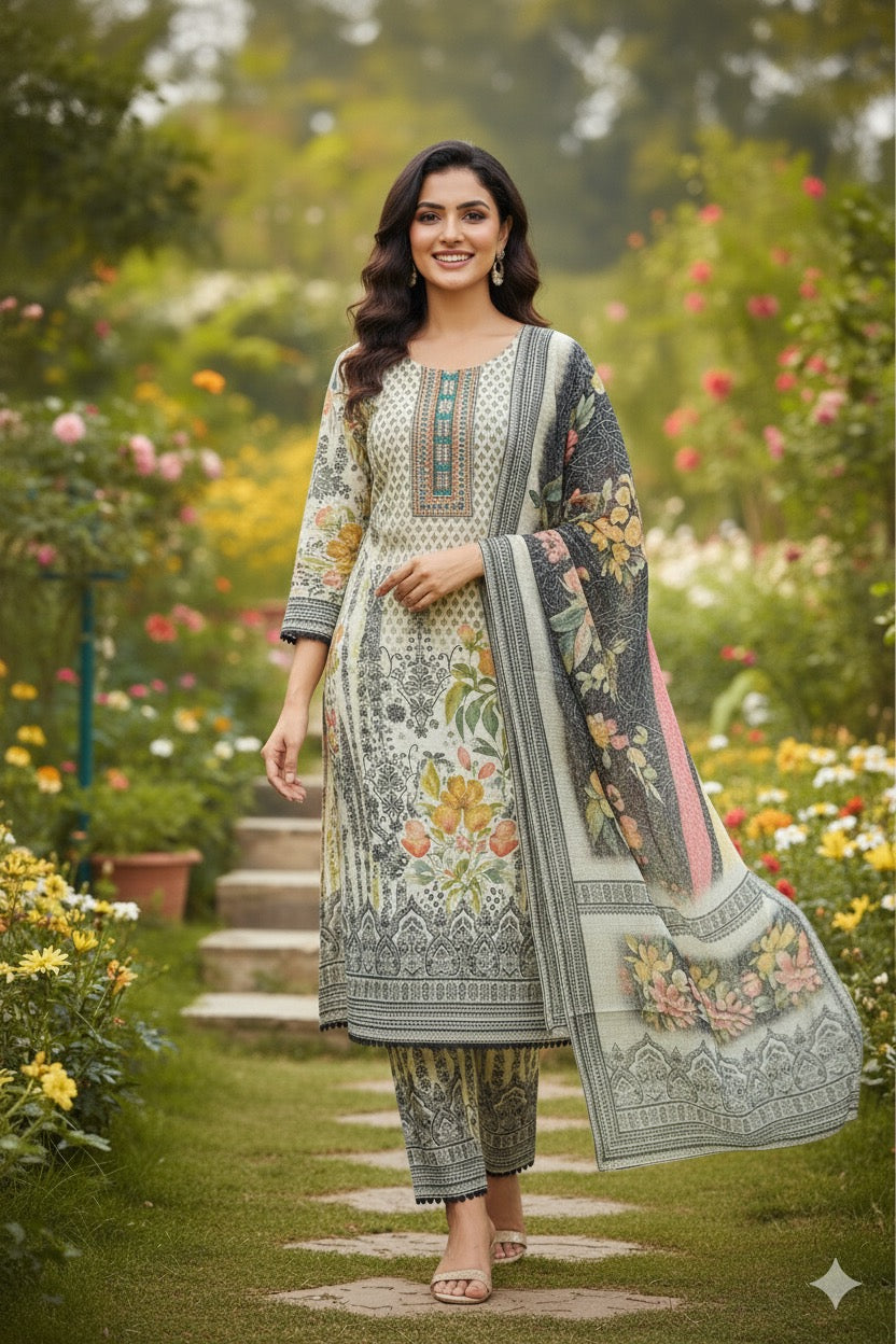 Step into timeless elegance with this ivory and charcoal printed suit set, featuring a harmonious blend of intricate patterns and floral artistry. The kurta showcases a delicately printed neckline with geometric and floral motifs, paired with coordinated straight pants and a beautifully printed dupatta that enhances the ensemble with its bold yet balanced design.