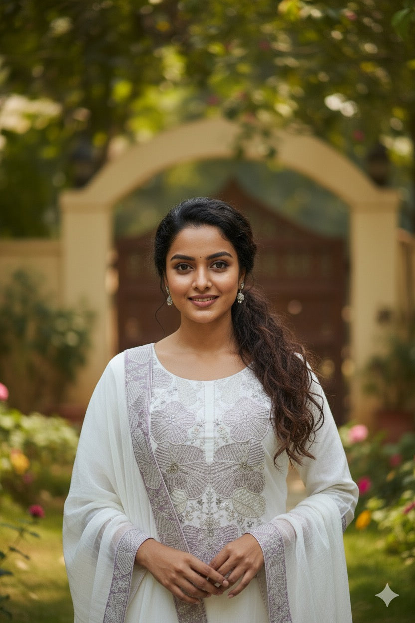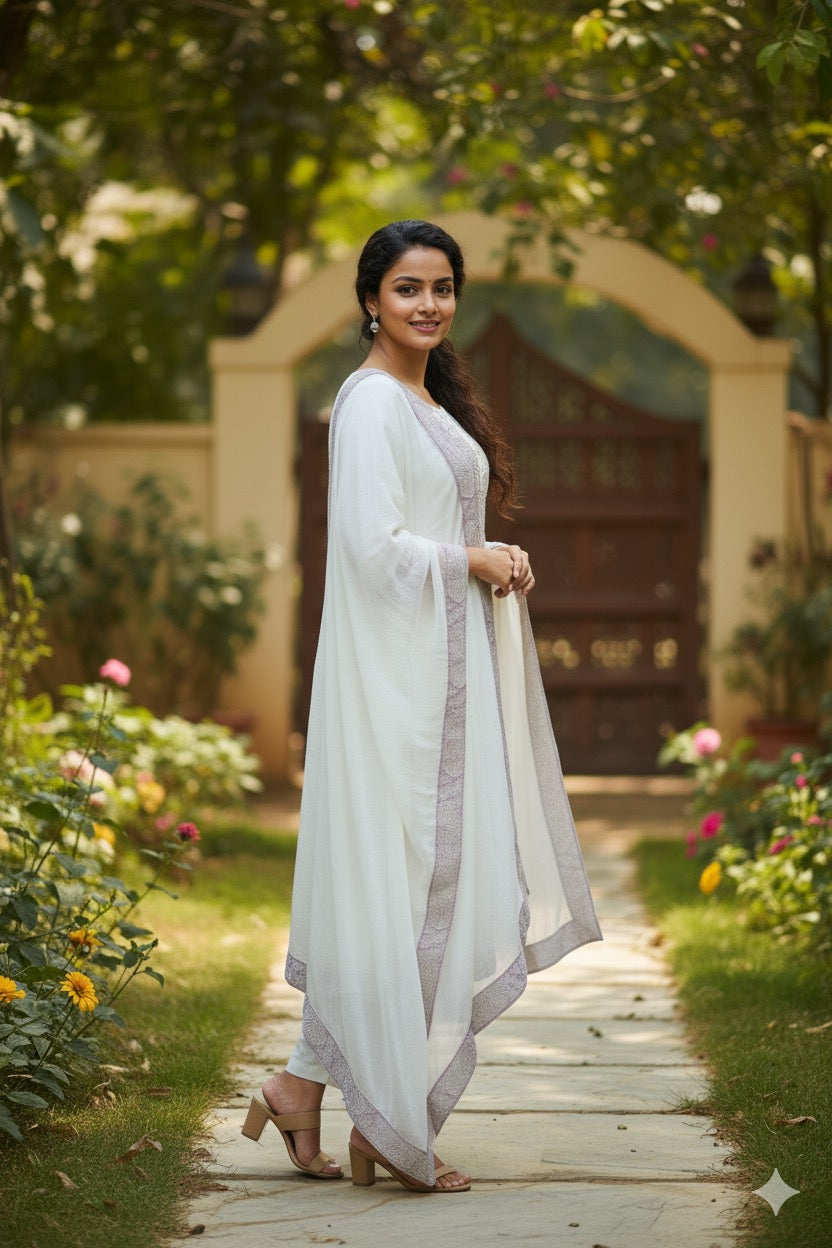 Step into timeless grace with this exquisite white chiffon Anarkali suit, designed to exude elegance and comfort. The ensemble features a flowing, floor-length silhouette that drapes beautifully, enhanced by a delicate silver embroidered border along the dupatta and neckline. Perfect for daytime festivities or evening gatherings, this outfit combines minimalist sophistication with traditional charm.